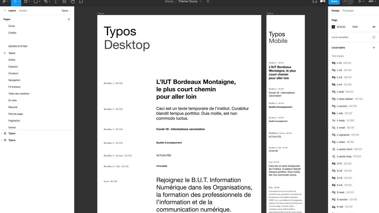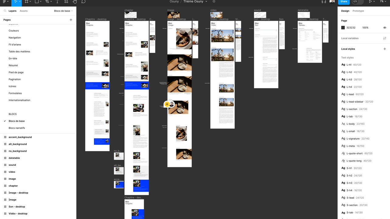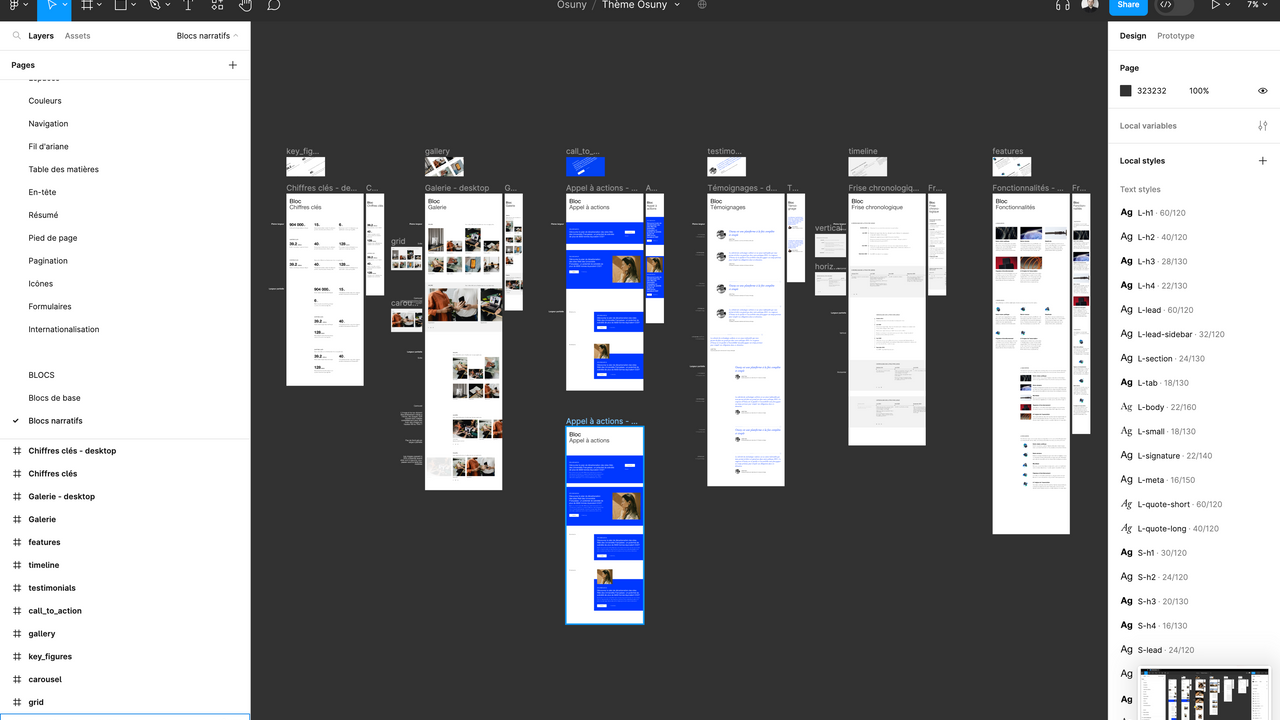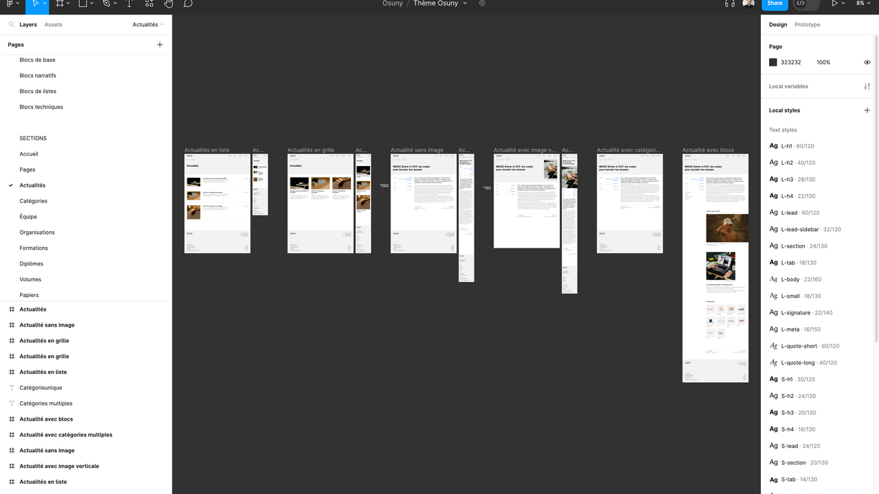 Le thème Figma contient tout le design system d'Osuny, les typos, les couleurs, les espaces, les menus, la navigation, la pagination, les icônes, etc. Il présente aussi toutes les configurations possibles de blocs, et les particularités des sections (actualités, formations...). Découvrez ci-dessous quelques captures d'écran du thème.