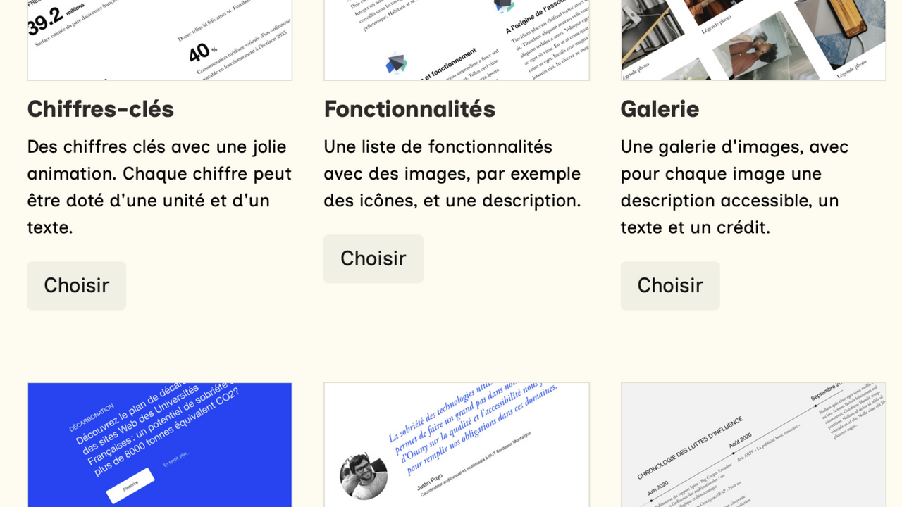Osuny fonctionne avec un ensemble de blocs permettant de répondre à la plupart des besoins éditoriaux, de façon simple, accessible et sobre. Découvrir tous les blocs (lien externe) (lien externe)